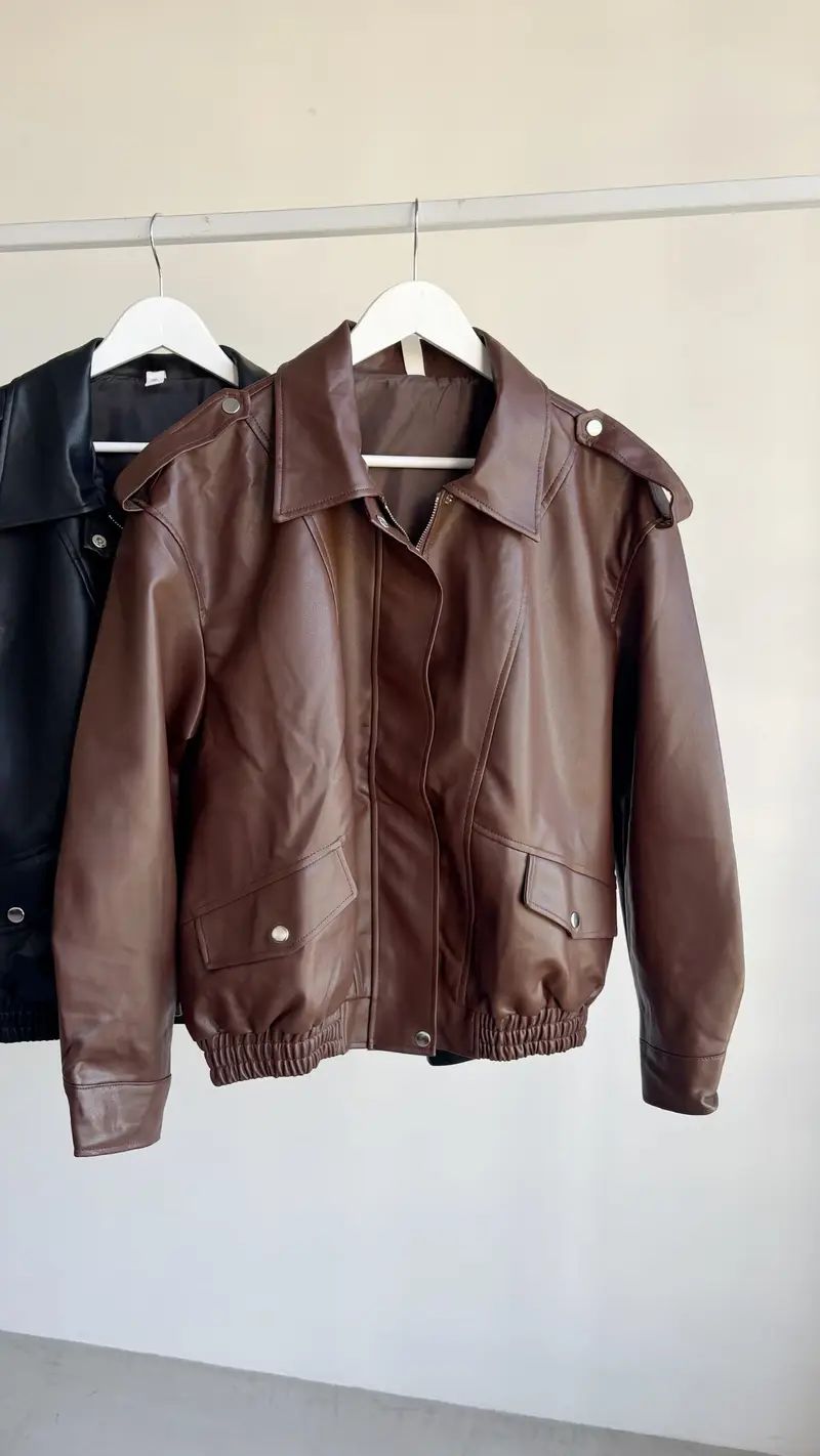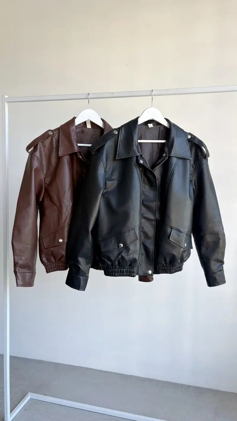 Campera de eco-cuero, forrado por dentro, con detalle de bolsillos y cierre. Corte Oversize.
