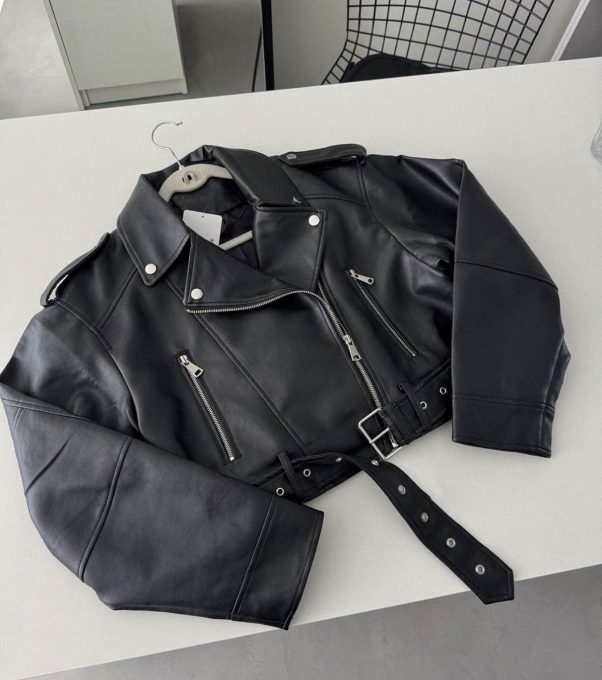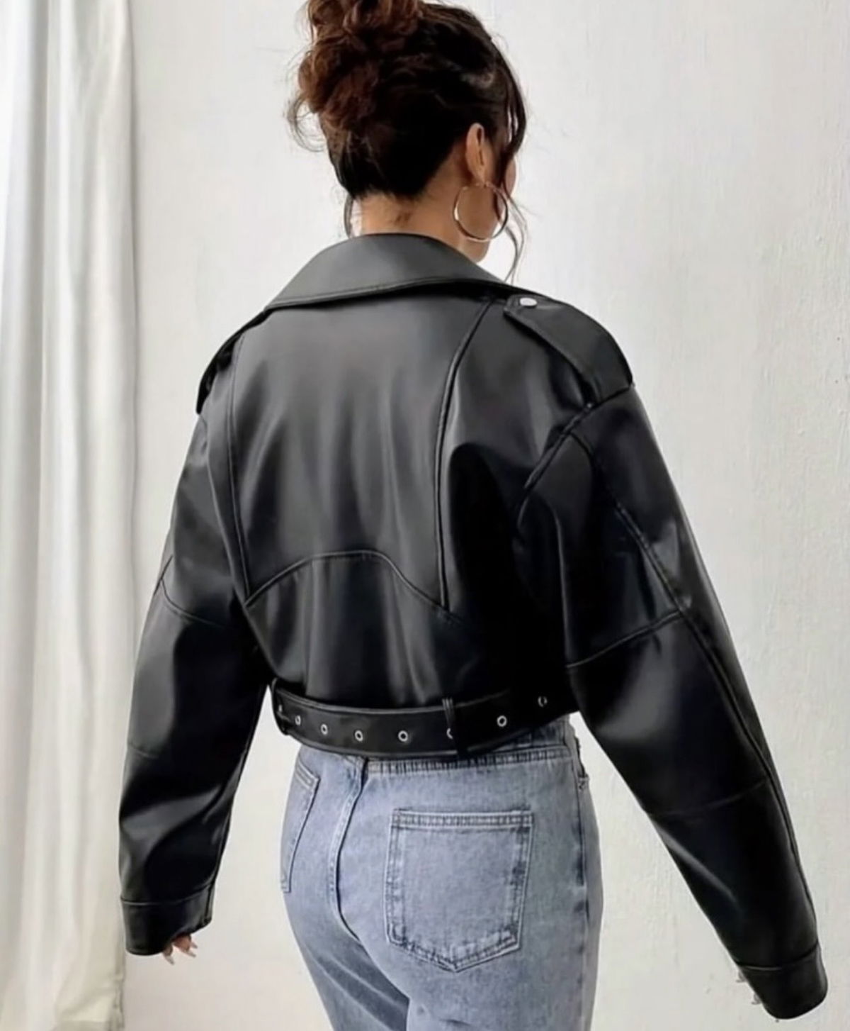 Campera Over ecocuero forrada . Con cinto y cierres en plateado .