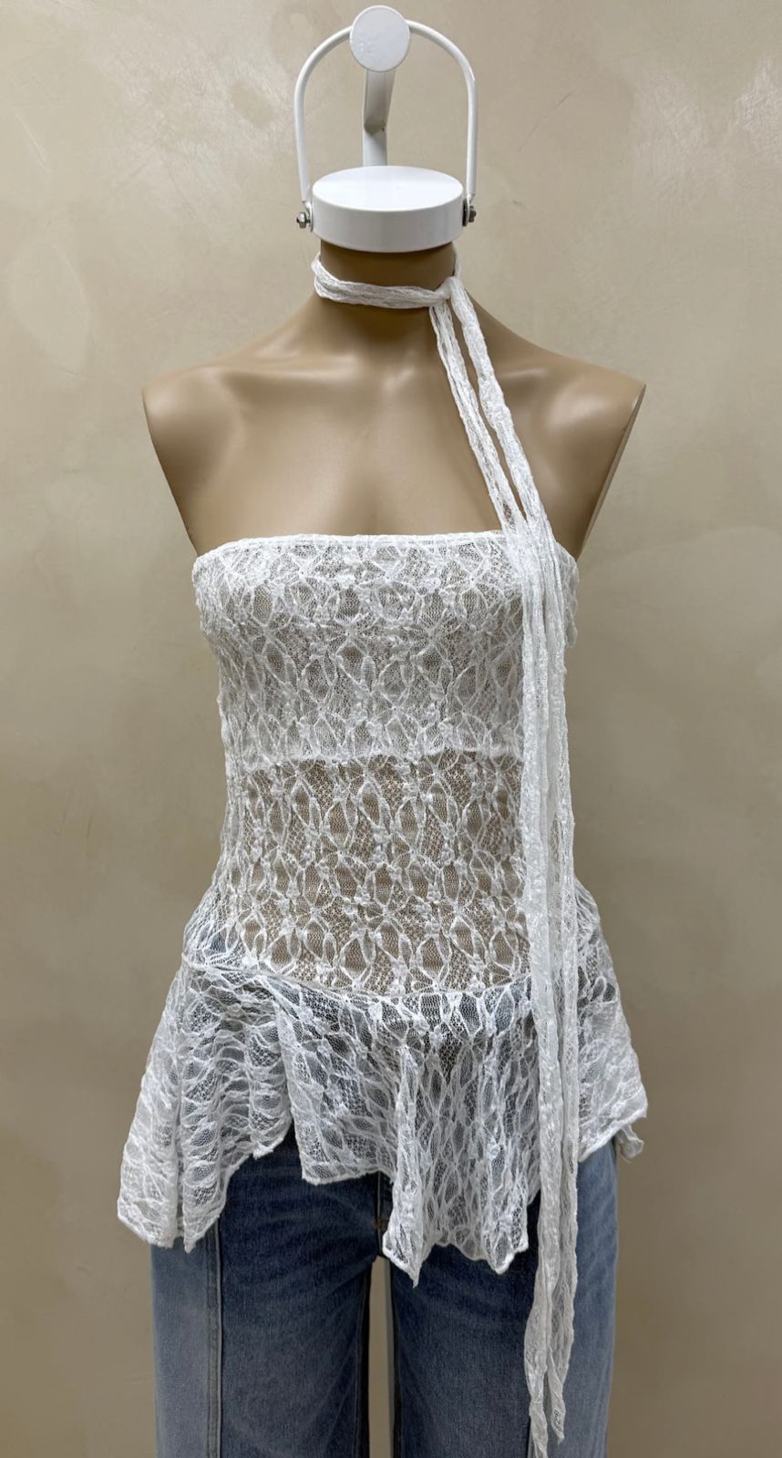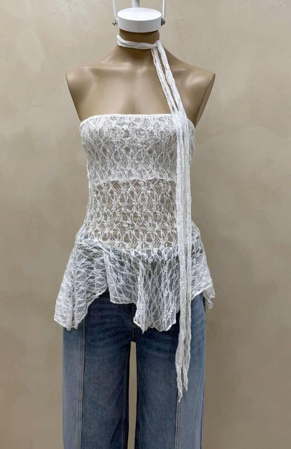 Strapless con volado irregular en lo ruedo.Lazo independiente de la misma tela que permita varias maneras de uso. Confeccionando en encaje con elástico.