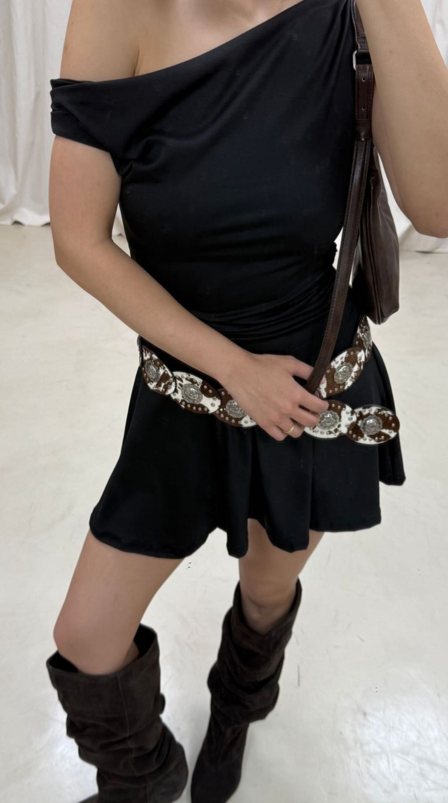 Vestido con un hombro descubierto y frunces en los laterales. La parte superior es adherente y abarca desde el hombro hasta la segunda cadera. Micofribra