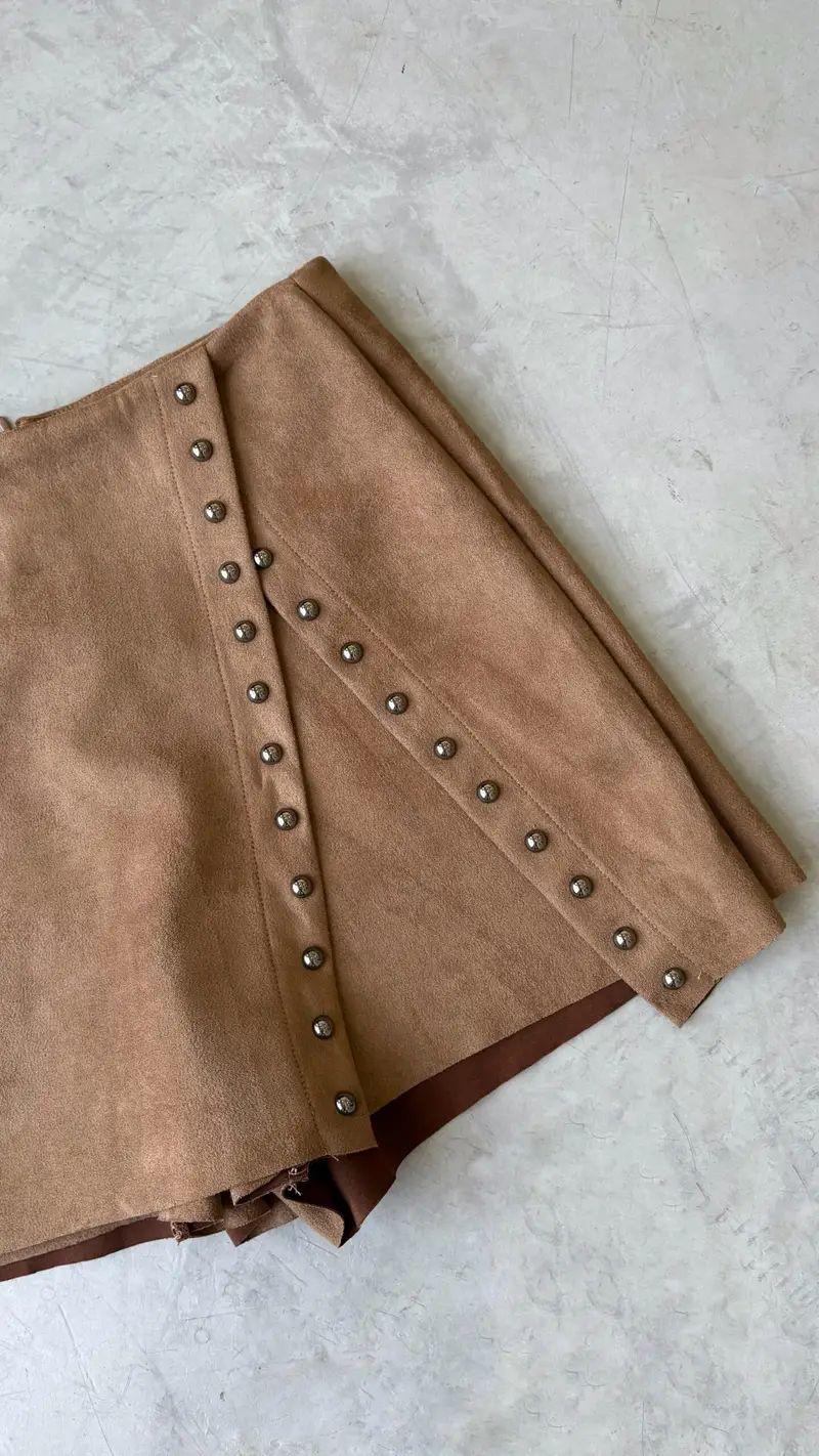 Short pollera de gamuza con detalle de tachas, tela elastizada.
