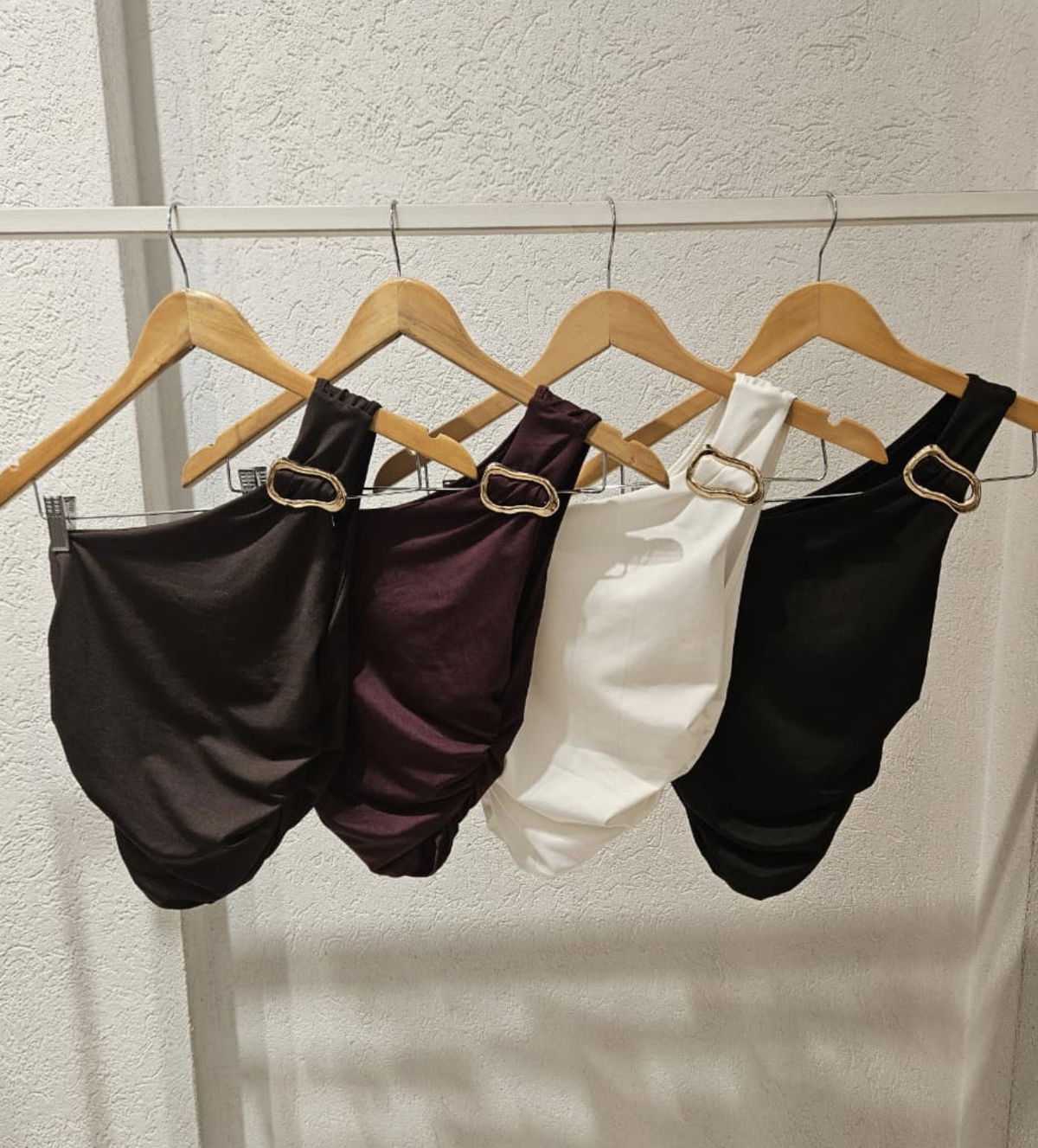 Top de 1 hombro con accesorio dorado y frunce a los costados.(nuevo accesorio)Tela: Microfibra– Talle único –