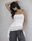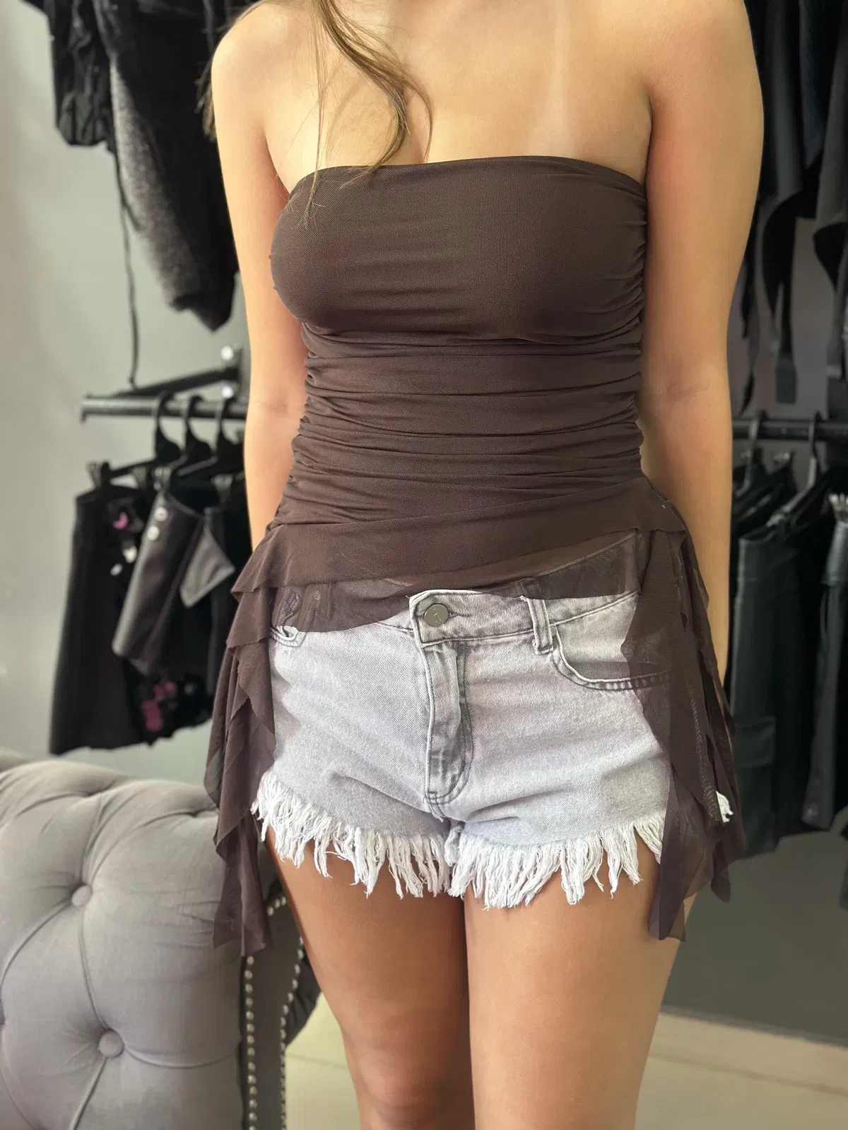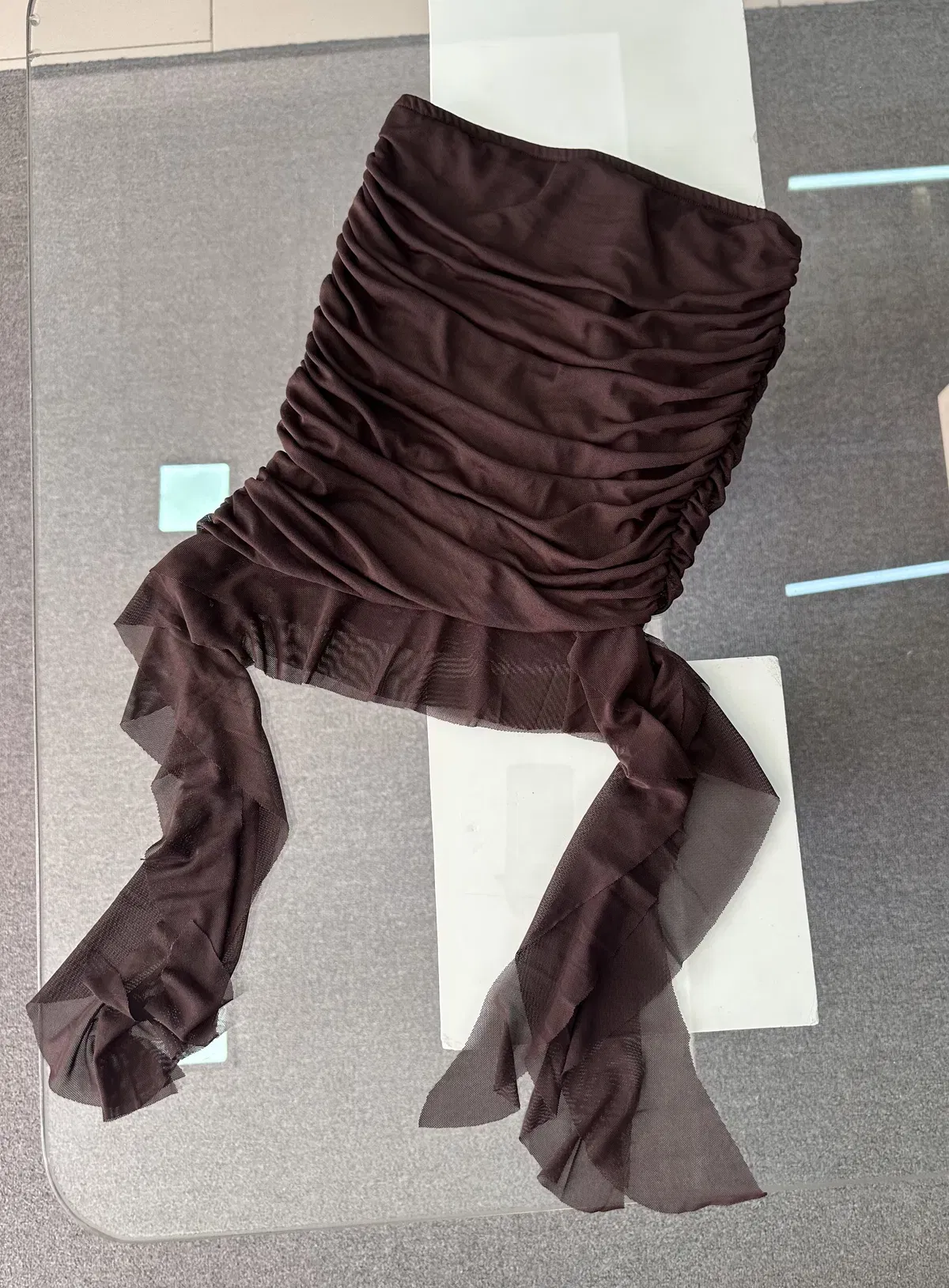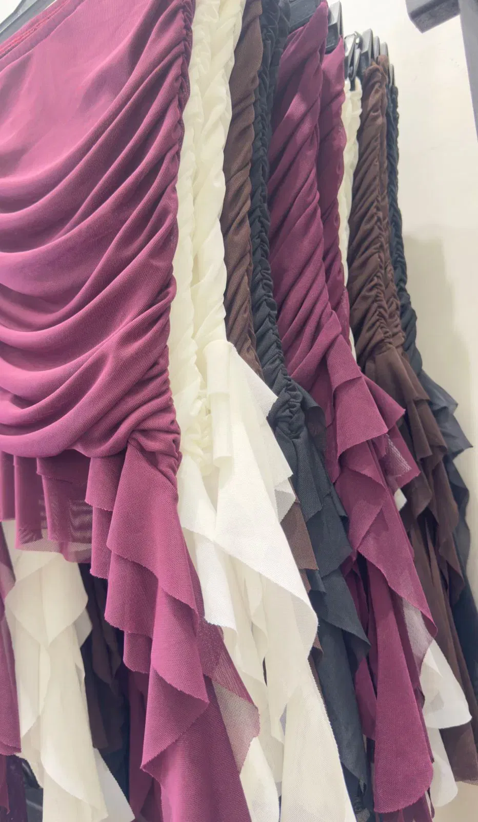 De tul fruncido, irregual, con volados en ambos costados, todo forrado.