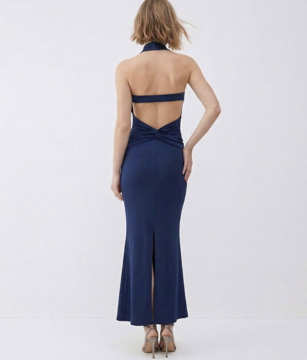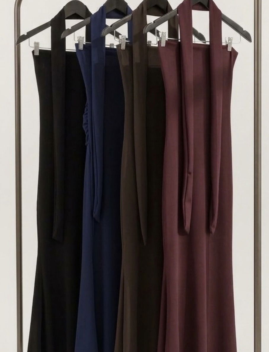 Vestido largo Strapless con corbatin suelto, espalda abierta con elastico forrado, detalle nudo cruzado.
