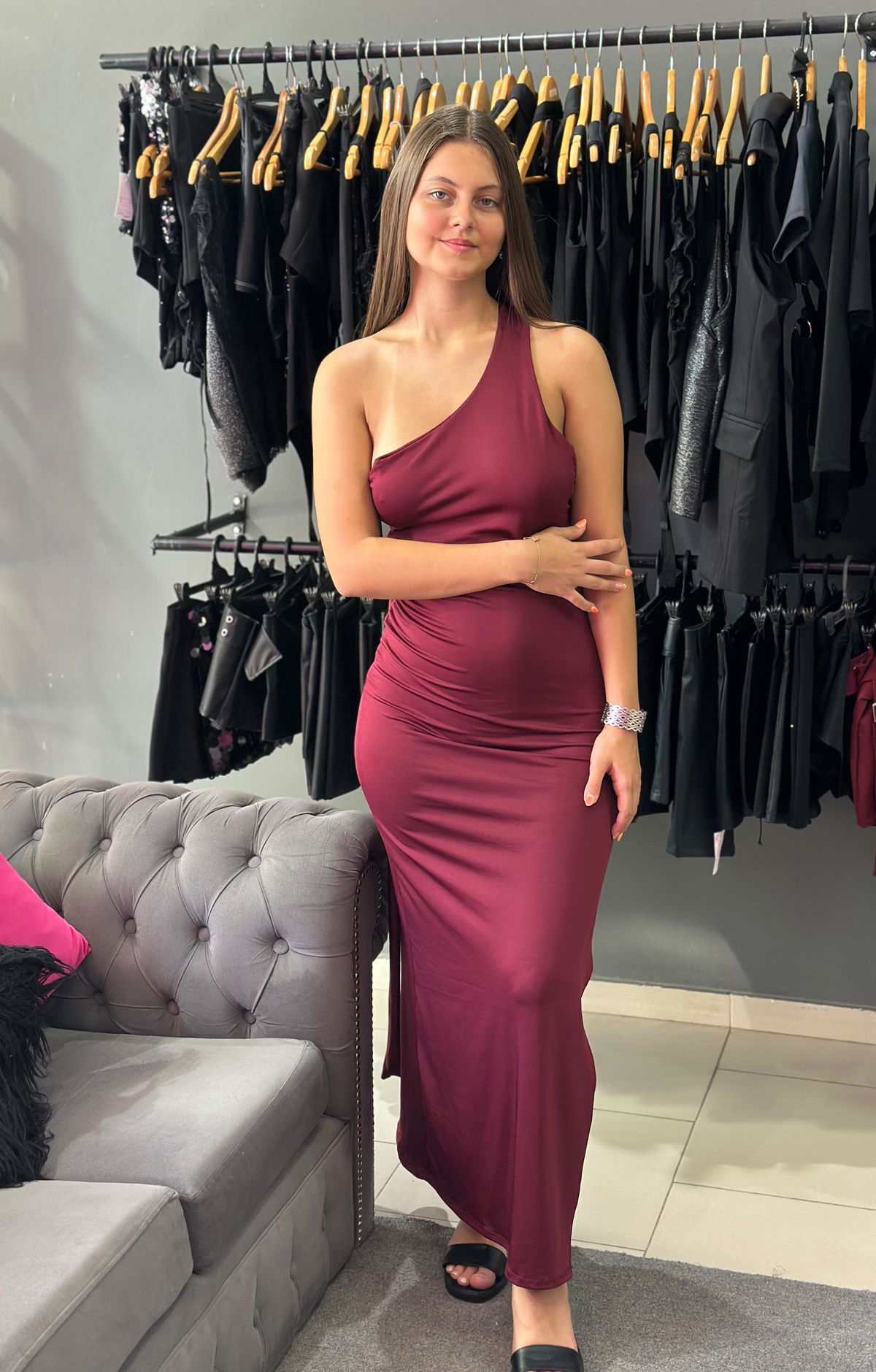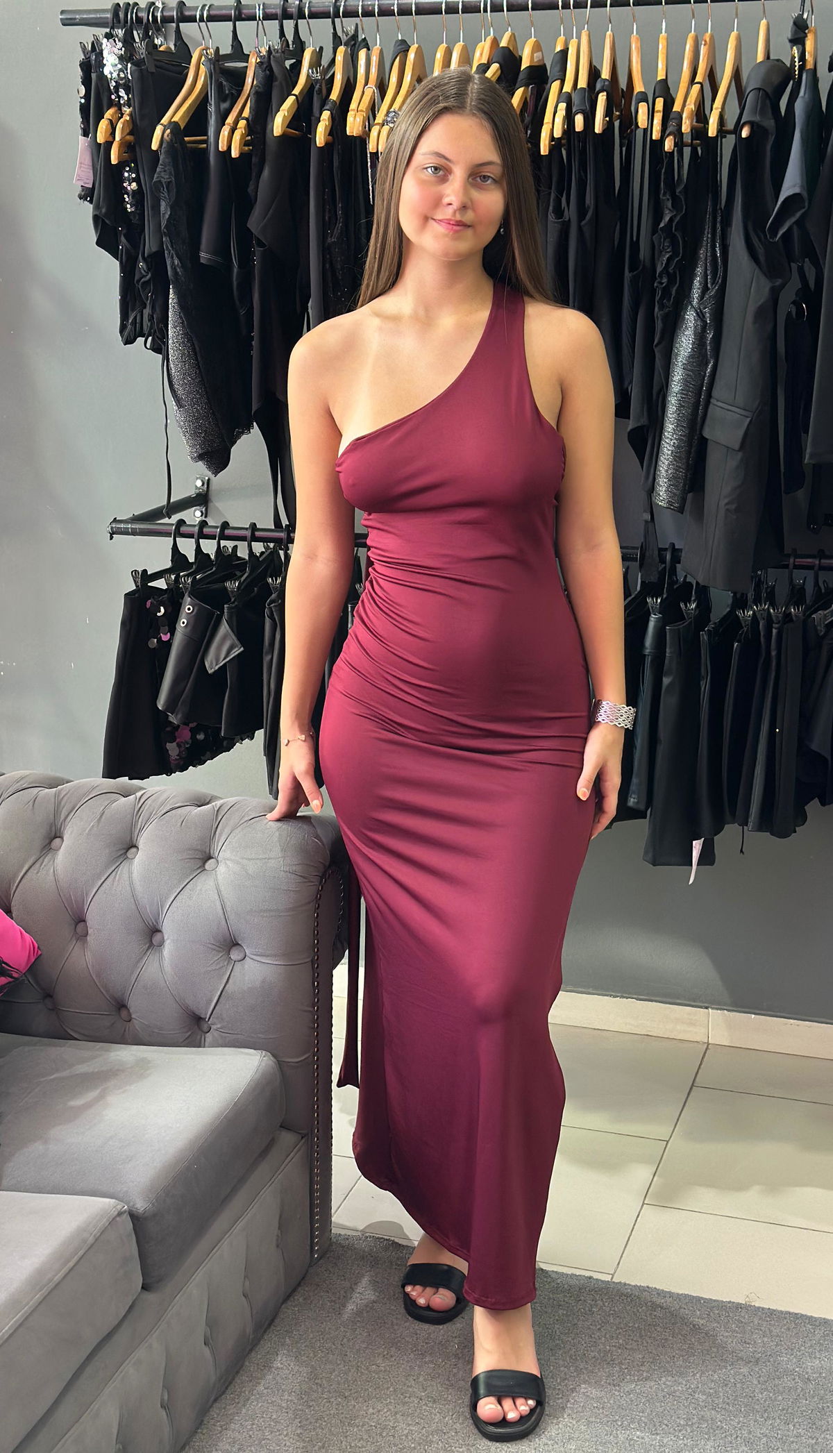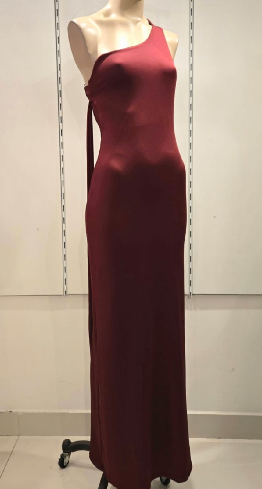Vestido largo 1hombro con frente doble, tira larga que se cruza en la espalda para ajustar con argolla