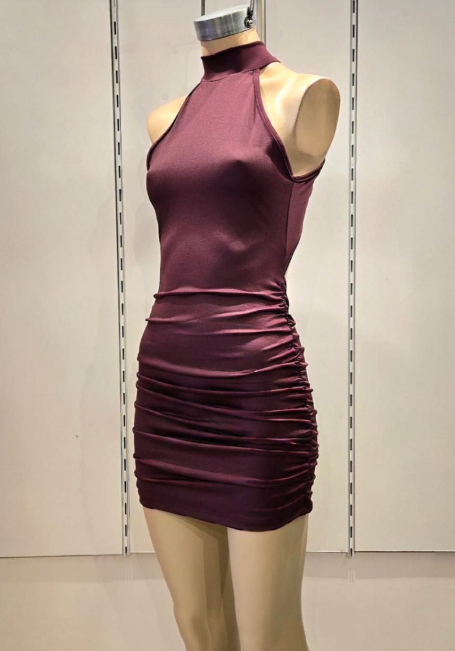 Vestido corto cuello 1/2polera, espalada abierta asimetrica con frunces elastizados laterales y parte atras.