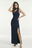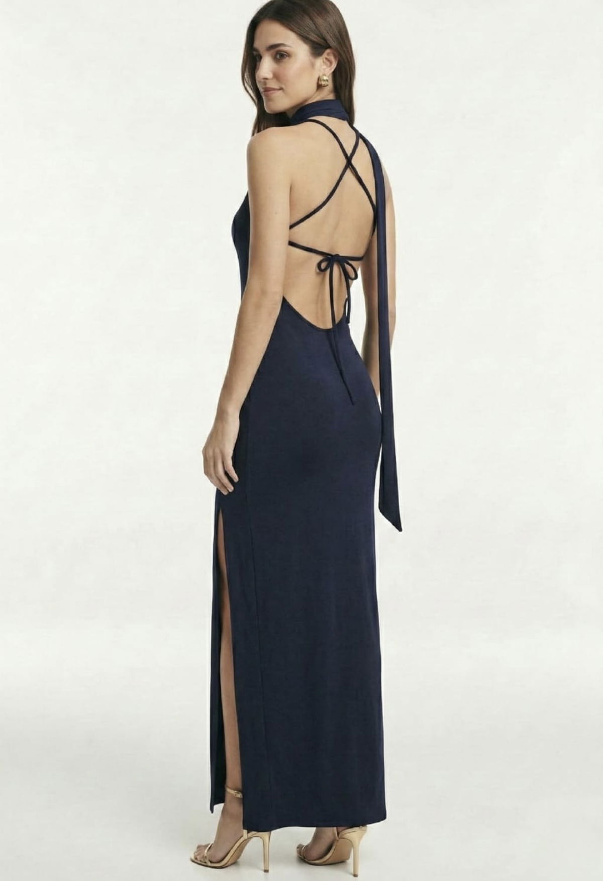 Vestido largo 1hombro con cuello corbatin, breteles cruzados para atar y abertura lateral.